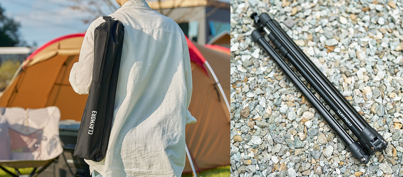 軽量性と耐久性を両立した三脚スタンド。 スムーズに高さ調節と脚の開閉が可能。 脚の先端にはペグ用のループが追加され、安定性も向上しています。